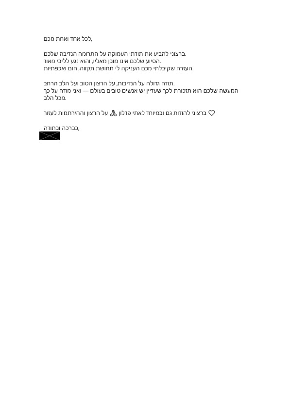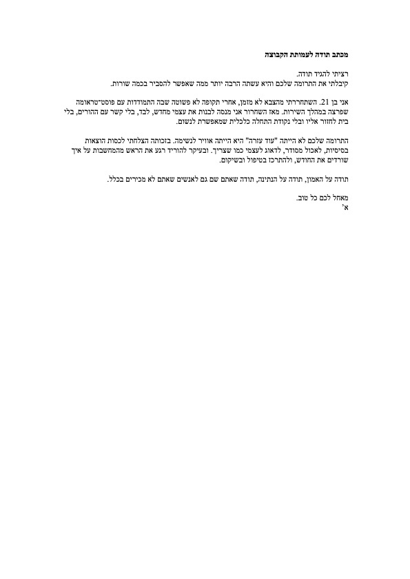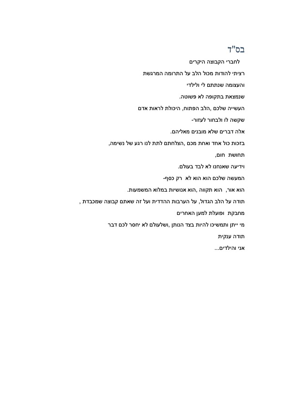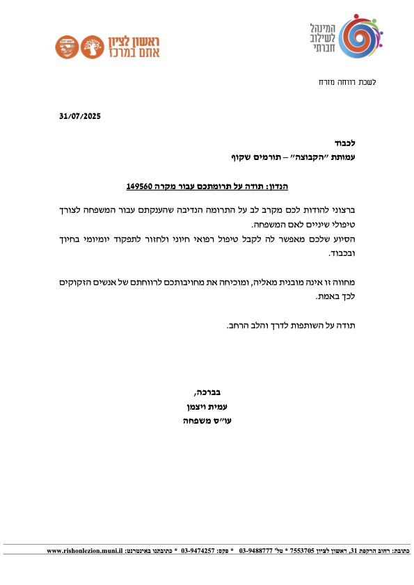 משפחה שהאב מתמודד נפש, ישנם שני ילדים בבית והריון נוסף. האם כרגע בשמירת הריון. האב כמעט ואינו מתפקד. מצבם הכלכלי קשה והם זקוקים לסיוע ברכישת מייבש כביסה.