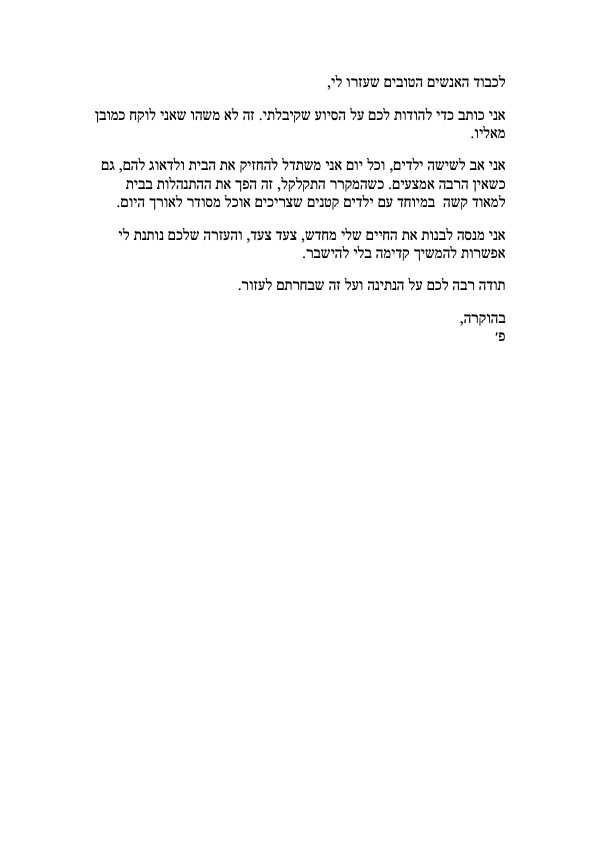 פ’ הוא גבר בן 28, נשוי ואב לשישה ילדים קטנים, הנמצא בעיצומו של תהליך שיקומי משמעותי. לצד זאת, פ’ מתמודד עם מציאות כלכלית קשה ביותר. הוא נמצא בתהליך חדלות פירעון,