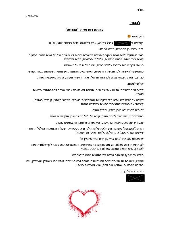 אישה נפגעת אלימות במשפחה, אם חד הורית לשני ילדים פעוטים, סבלה מאלימות רגשית מילולית ופיזית והיום עושה צעדים ראשונים ביציאה לדרך חדשה ועצמאית יותר. עבדה בעבר במרפאות סביב רפואה משלימה
