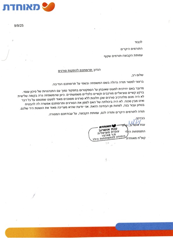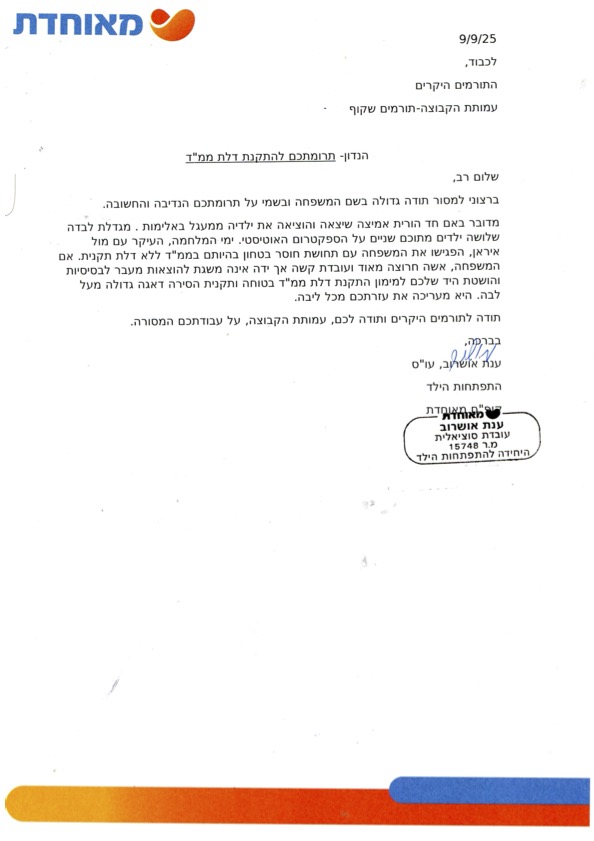 האם ממשיכה לסבול מתסמיני הטראומה של ה 7.10. מאז שחזרו ליישוב בגבול עזה (כשנה) לא הצליחו למצוא טיפולים מתאימים לילדות, מלבד רפלקסולוגיה. האם והאב מטופלים אך ללא התקדמות משמעותית. האם