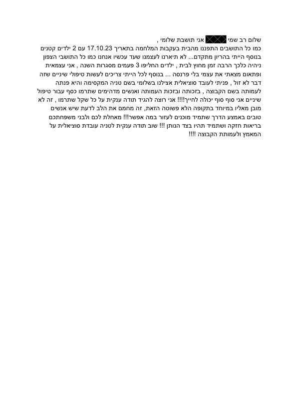 משפחה בת 4 נפשות: זוג הורים ו-2 ילדים קטנים בני 7 ו-5 .המשפחה מפונה משלומי לחיפה. האם בהריון מתקדם, עצמאית שהתפרנסה מבישול ביתי. המשפחה מוכרת לרווחה, בליווי אינטנסיבי של המחלקה,