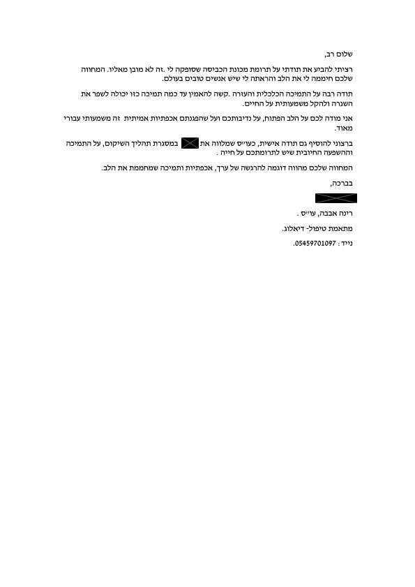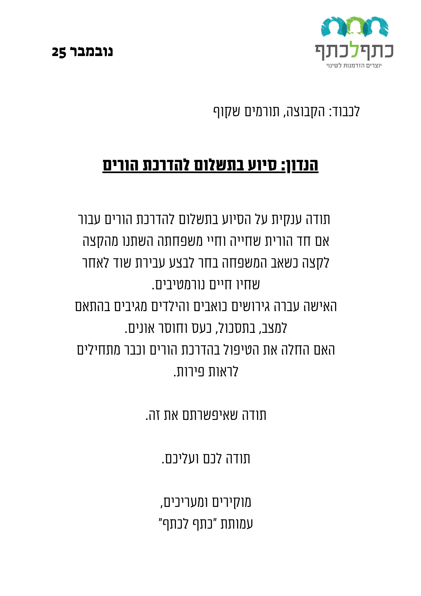 אם חד הורית לשתי בנות המגדלת אותן לגמרי לבד. משתתפת בתוכנית של מרכז אלימות לאחר שהייתה במעגל האלימות. זקוקה לעזרה כלכלית משמעותית.