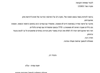 מדובר בזוג+3 ילדים קטנים. הגבר אינה עובד, מתמודד עם בעיות רפואיות ומקבל קצבת נכות. האישה עובדת במשרה חלקית, מתמודדת עם בעיות רפואיות ומקבלת קצבת נכות. הילדים מתמודדים עם בעיות רפואיות.