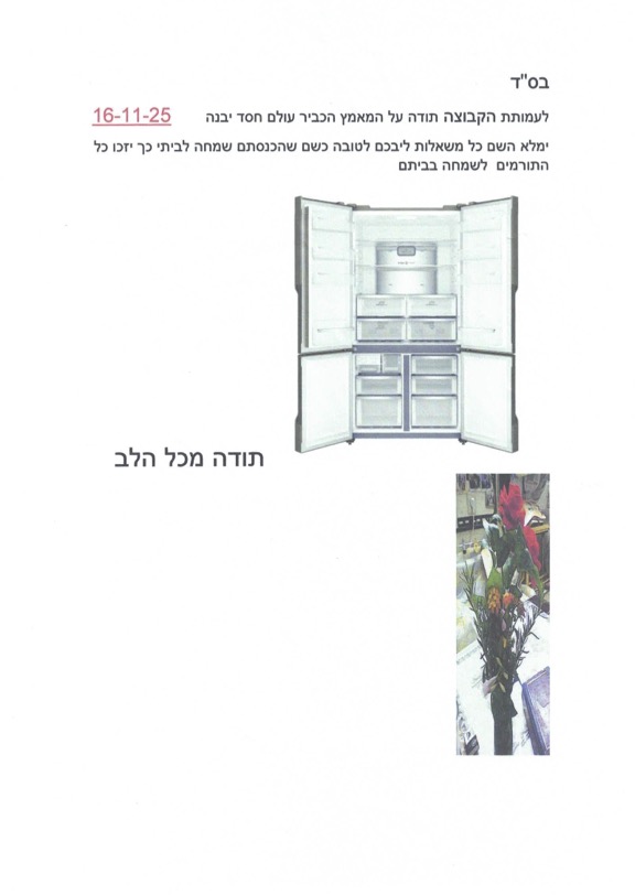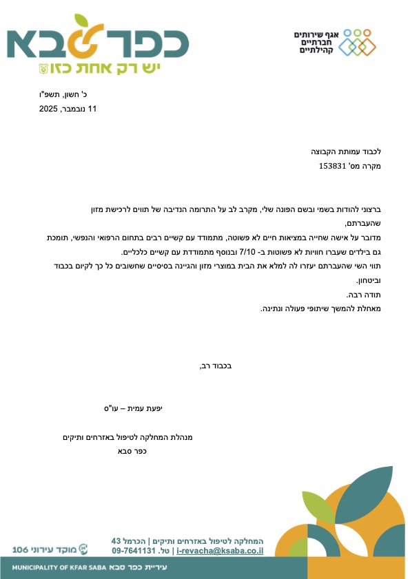 בת 48, נשואה ואם לילד, המתמודדת עם סכיזופרניה, זקוקה לעזרה ברכישת מוצרי בסיס הדרושים לבית. האישה מצויה בתהליך שיקומי במסגרת סל שיקום מזה כשמונה חודשים, ומשקיעה מאמצים רבים לנהל שגרת