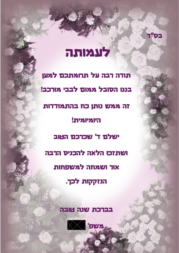 זוג הורים ל-9 ילדים המקיימת אורח חיים חרדי. המשפחה מתגוררת בדירה פרטית שבבעלותם, עם 2 חדרי שינה ומתקיימת מקצבת נכות של אחד הילדים. זקוקים לסיוע ברכישת עריסה וכסא לתינוק.