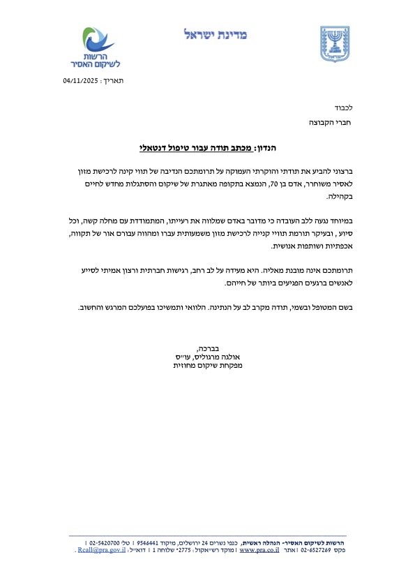 אסיר משוחרר, תחת תוכניות שיקום. מדובר במקרה סוציאלי מורכב וקשה. ב׳ בן 70, מתקיים מקצבת זקנה ועובד בעבודה פיזית קשה בשכר מינימום, בנוסף סועד את אשתו חולת הסרטן. נשמח לעזרתכם במימון סל מזון.