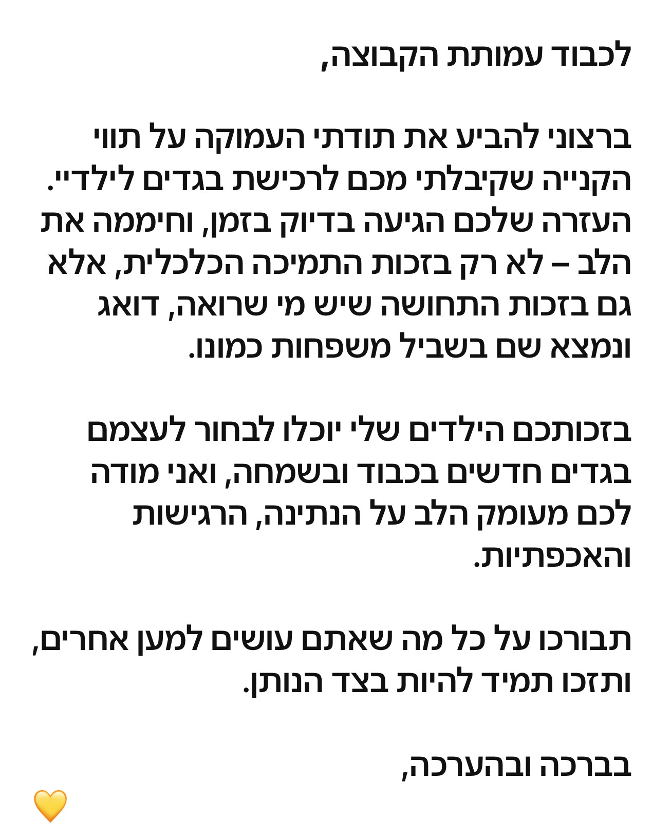 אמא גרושה לשני בנים קטינים בגילאי 6 ו-11. זקוקה לסיוע ברכישת ביגוד לתחילת שנת הלימודים הקרובה. מתקשה לקנות בכוחות עצמה בשל מצב כלכלי לא פשוט בכלל - גרושה ללא מזונות ונמצאת בתהליך של חדלות פירעון בשל חובות רבים. חיה מהיד לפה ונמצאת בתוכנית נושמים לרווחה על מנת לסייע לה לצאת לדרך חדשה.